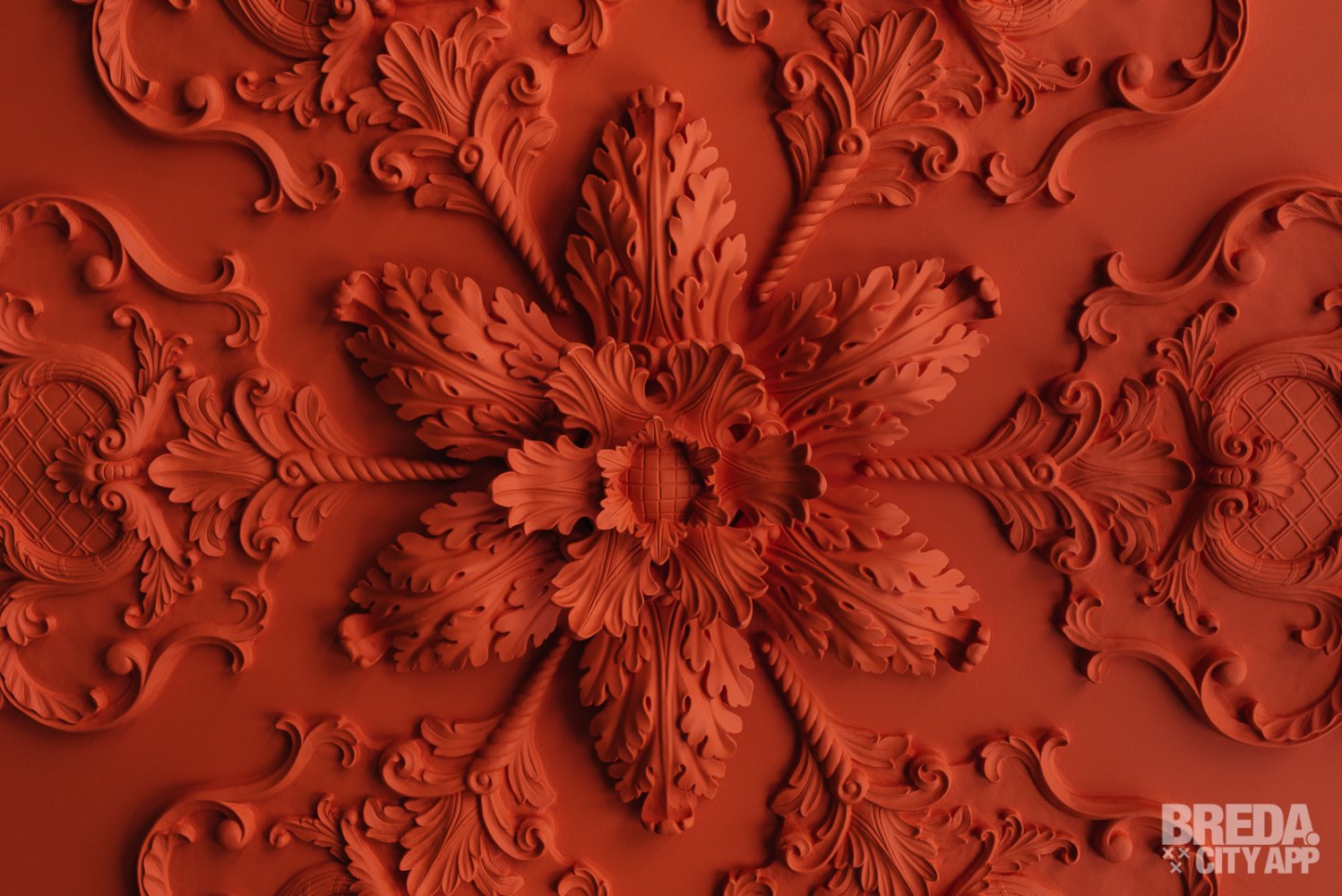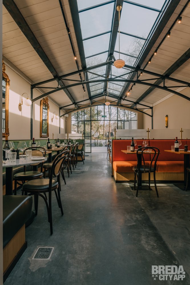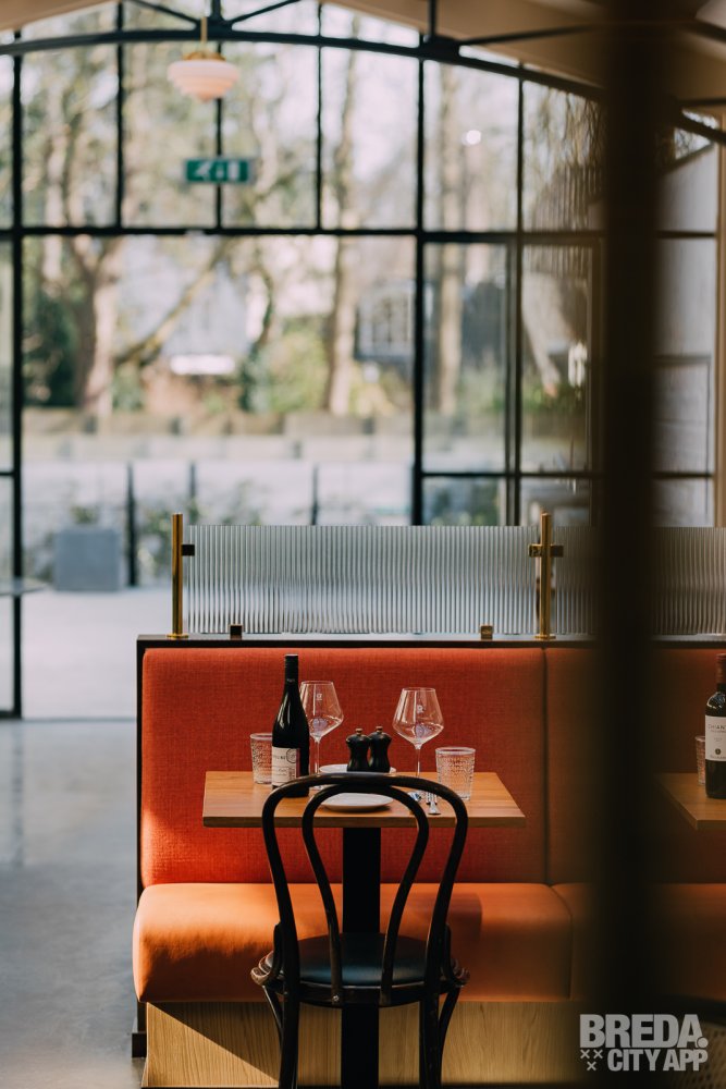 Opvallend in het voorste gedeelte van de zaak is het oranje plafond, dat overloopt in de muren. Dit geeft de zaak naar onze mening een speelse en moderne twist. De open keuken bevind zich nu in het midden van de zaak, waar voorheen het buffet van Loff stond.
