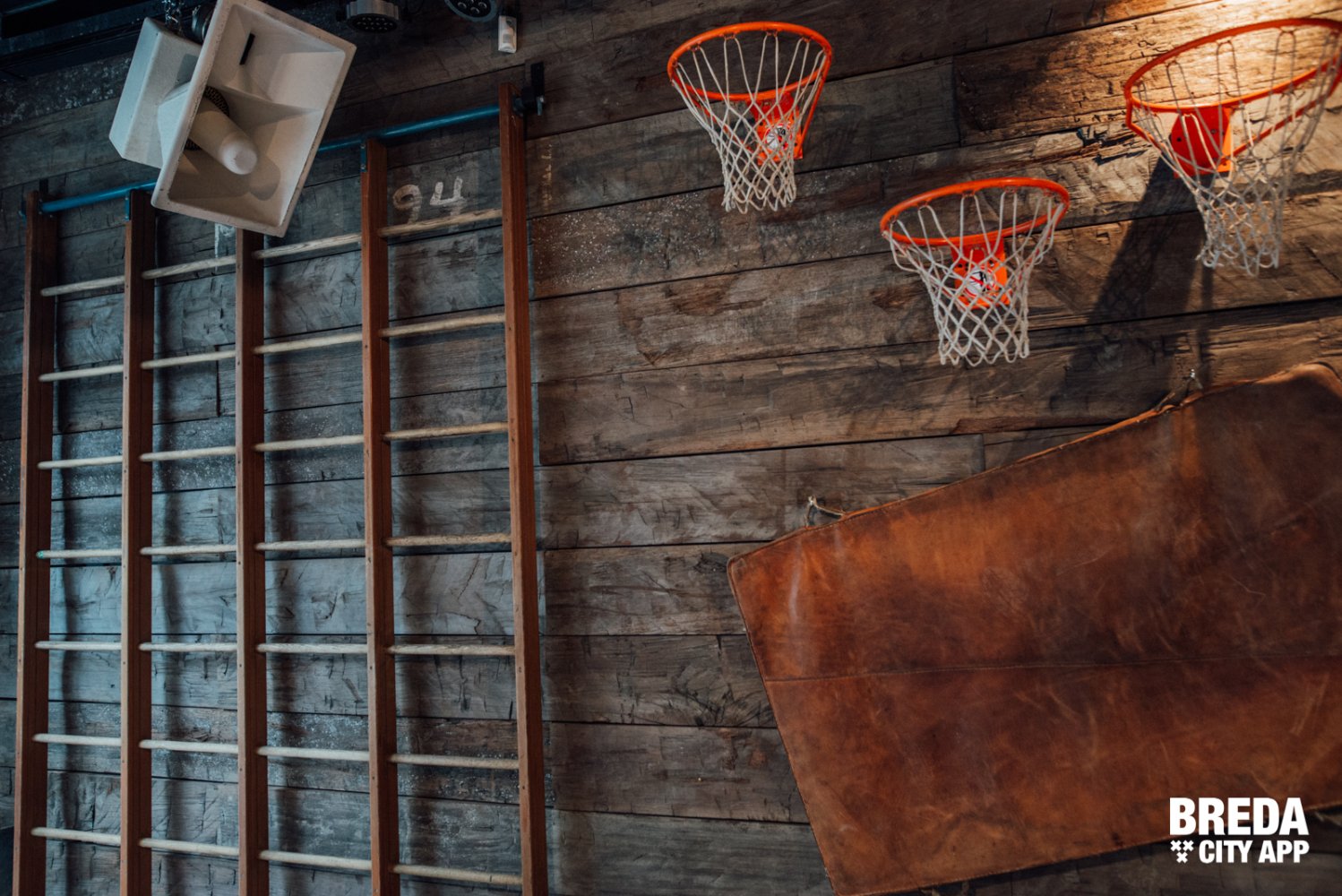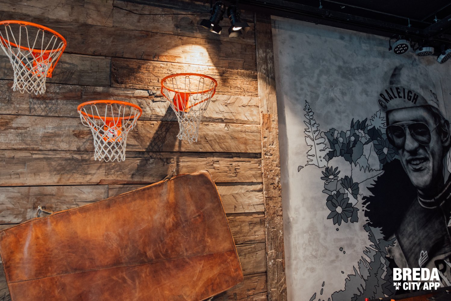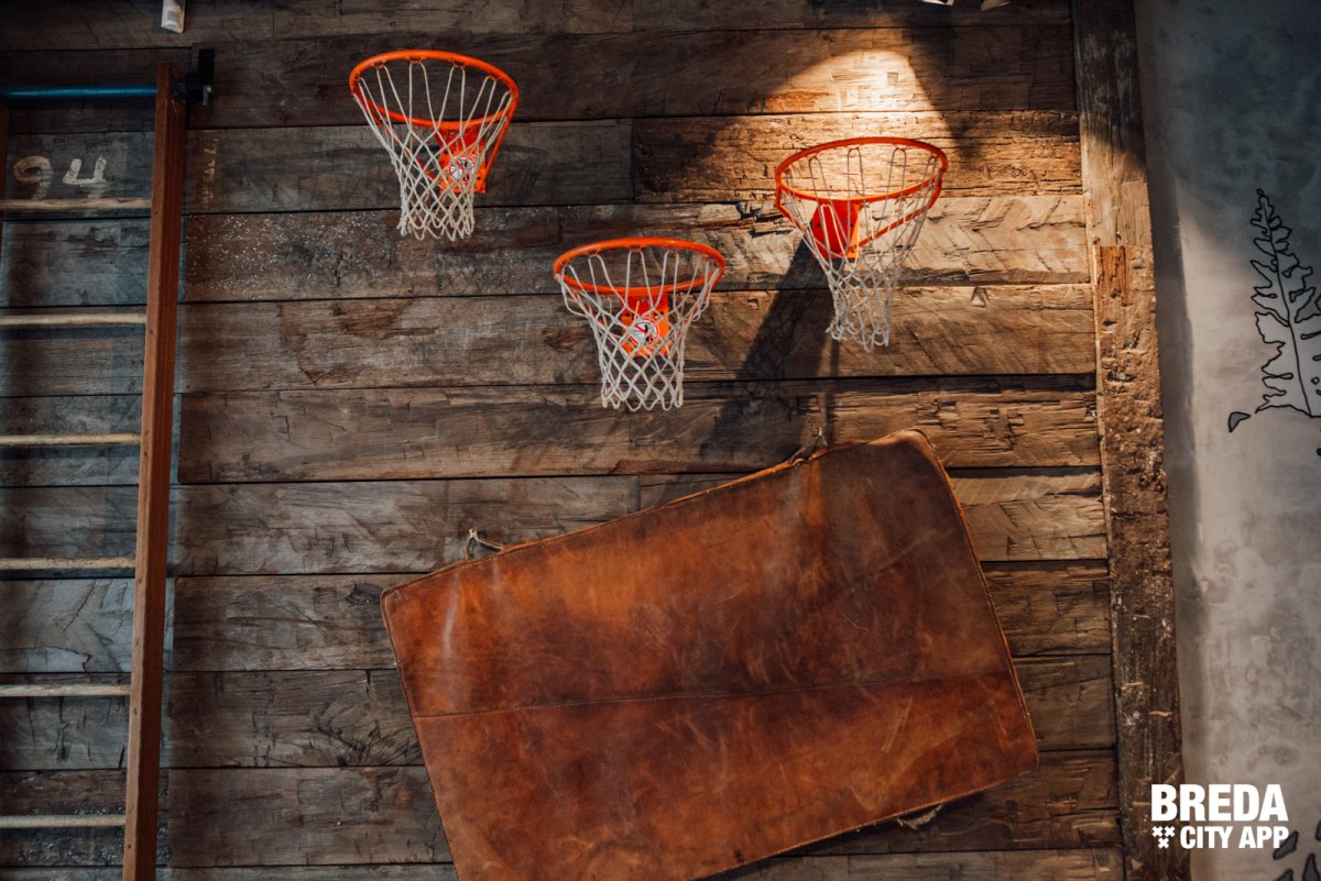 De diverse decoratieve en authentieke sportattributen in combinatie met verschillende werken van graffiti artiesten op de muur zorgen voor een echte NY-styl inrichting.