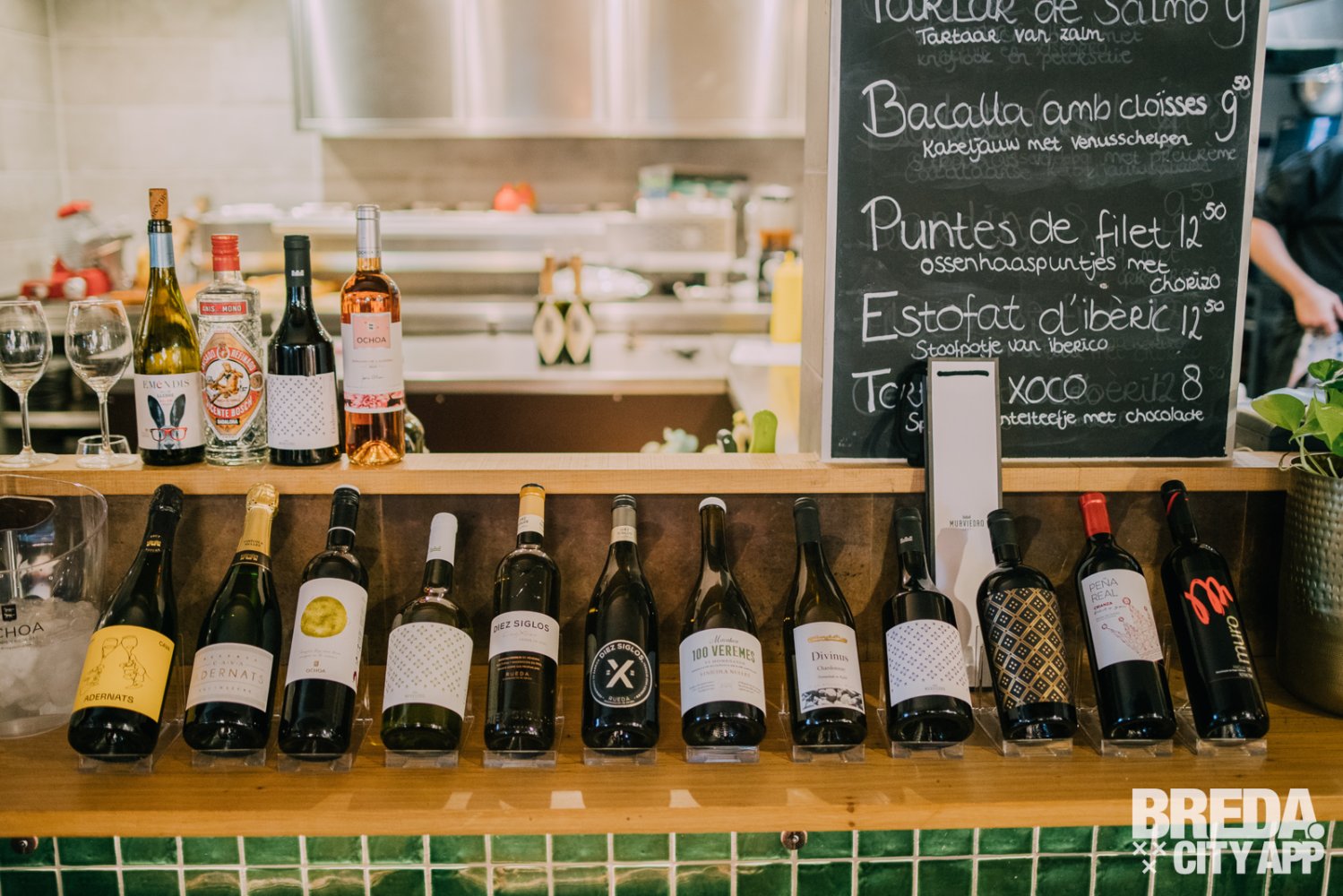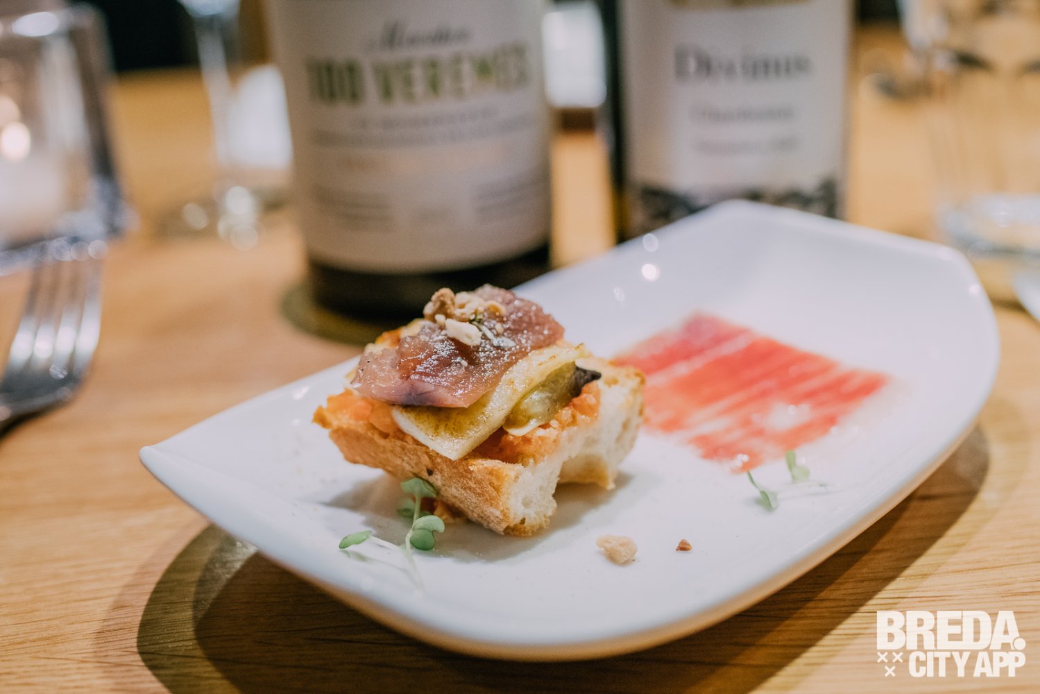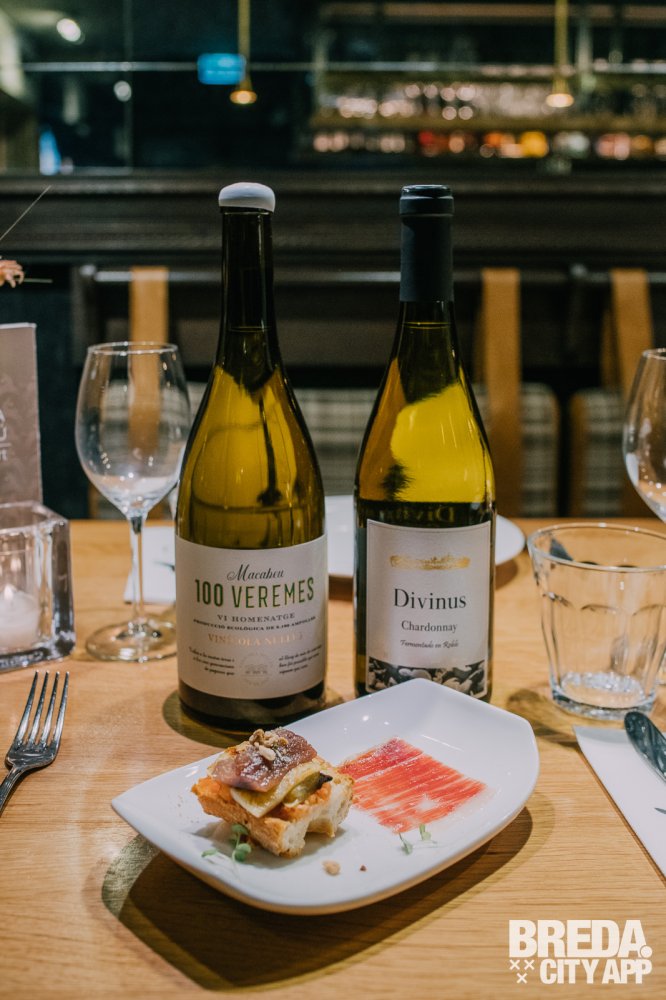 De Mabeco van 85 jaar oude stokken uit Tarragona met houtlagering is een bloemige witte wijn met in de neus tonen van bloemen, noten, boter en vanille. We proeven onder andere citrus, meloen, kruiden en een lichte hint van vanille. De Divinus Chardonnay is de Grand Cru uit Spanje (Pago gecertificeerd) en heeft in de neus tonen van perzik, hints van noten en iets licht rokerigs. De wijn is zat en vol van smaak met duidelijke tonen van rook en een mooie lange afdronk. Bij deze wijnen proeven we het klassieke gerecht pan tomaat met een twist. Gemaakt van geroosterd brood met tomaten, broodgeroosterde aubergine, gebakken appel, gerookte makreel, amandel en daarnaast pata negra 100% bellotta. Het vettige van de vis en ham gaat erg mooi samen met beide wijnen.