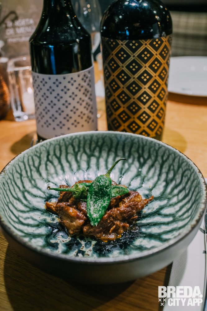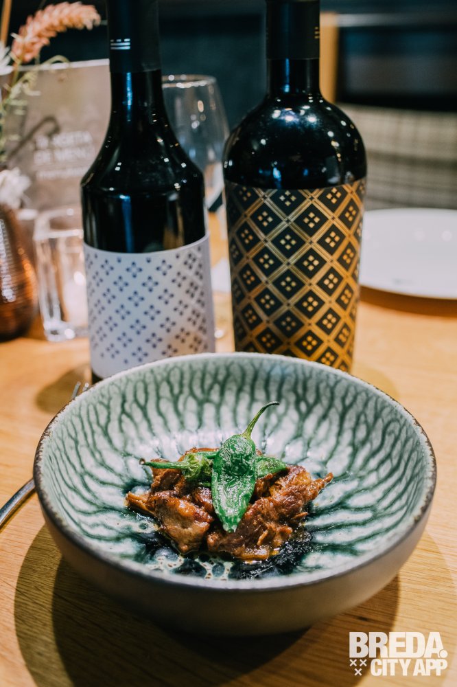 Bij deze twee wijnen kunnen we mooi proeven wat een houtlagering doet met de smaak. Het zijn namelijk dezelfde wijnen, maar de Murviedro Sericis Cepas Viejas heeft 14 maanden in Frans eiken gelegen. De Galeam Monastrell ruikt intens fruitig met kruidige tonen. De wijn smaakt vol en warm met een lange afdronk. De Sericis Cepas Viejas is complexer met krachtige aroma’s van rijp fruit en eiken. We proeven een complex pallet met rijpe tannines en geroosterde smaken in de afdronk. Bij deze twee rode wijnen eten we Iberico fat. Deze stoverij van Iberico is gemaakt met drie verschillende pepers, membrillo, pruimen en pimentos de padron.