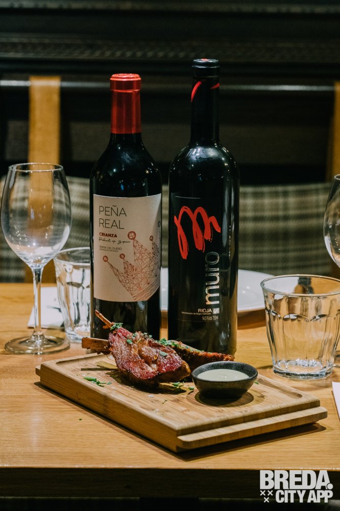 Crianza is de Spaanse aanduiding voor minimaal zes maanden houtrijping en twee jaar totale rijping. De Peña Real Crianza afkomstig uit Ribera del Duero is complex en elegant in de neus met aroma’s van rood fruit, vanille, karamel, koffie, drop en een hint van balsamico. De wijn proeft krachtig, doch zacht en heeft tonen van rood fruit, chocolade en licht balsamico in de afdronk. De Miguel Angel Muro afkomstig uit Rioja, heeft 17 maanden op hout gelegen en is een wijn die veel in de prijzen is gevallen. We ruiken intense geur met zoethout, balsamico en vanille. De wijn heeft een zeer evenwichtige zuurgraad met geroosterde tonen, hout en licht kruidige aroma’s in de afdronk. We eten hierbij lamskotelet met zeezout flakes en aioli. Beide wijnen zijn krachtig genoeg bij dit gerecht en completeren het op hun eigen manier.