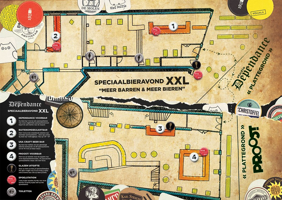 Omdat deze avond steeds meer op een bierfestival begint te lijken is er een plattegrond ontwikkeld, waar op aangegeven is waar de verschillende barren zijn, waar de glazen te halen zijn en waar de spoelstations staan.