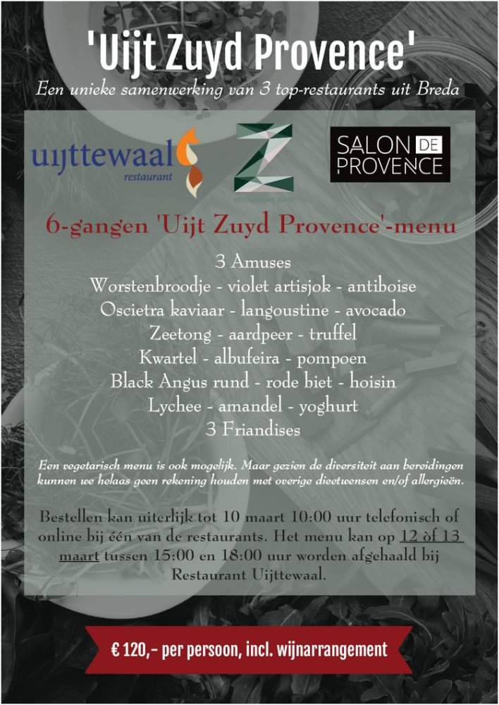 Restaurant Zuyd blijft je verassen. Eerder deze maand las je al over de drie heerlijke thuis menu's en de nieuwe "think inside the box"van restaurant Zuyd. Dit keer slaan zij de handen ineen middels een unieke samenwerking met twee mooie restaurants, namelijk Uijttewaal en Salon de Provence.
