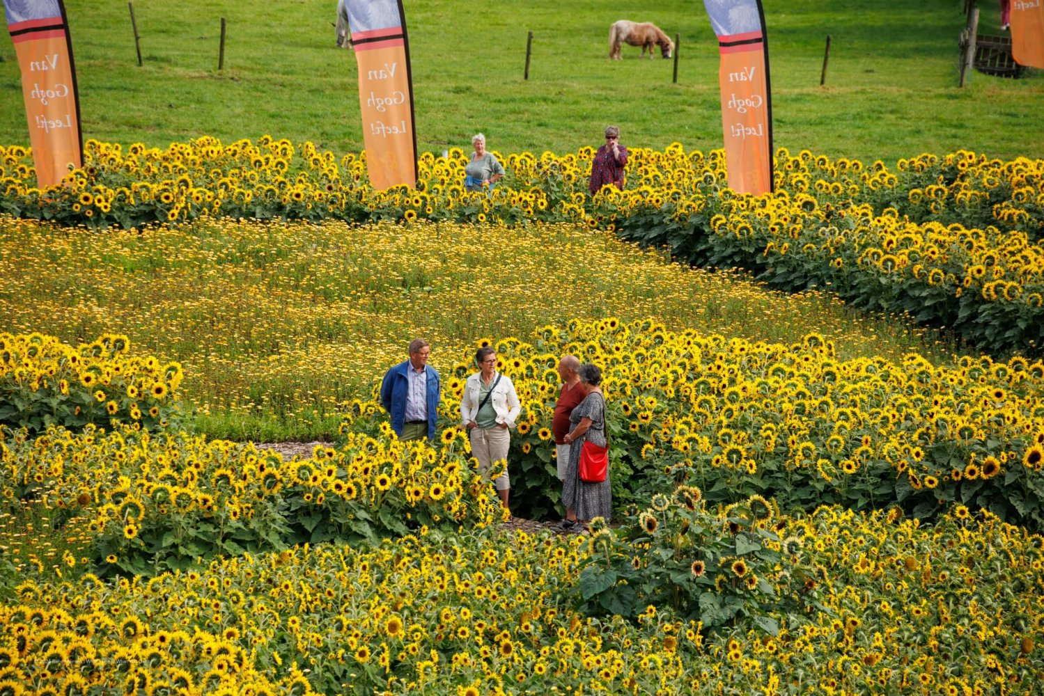 Van Goghs "Vaas met 15 zonnebloemen" tot leven gebracht met duizenden bloemen bij Menmoerhoeve in Etten-Leur. Dit bijzondere kunstproject is gratis te bezoeken en trekt veel bezoekers.