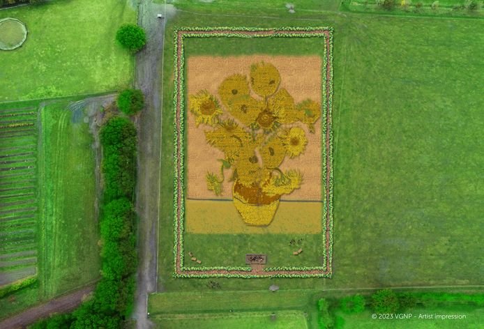 Het schilderij is opgebouwd uit zonnebloemen, goudsbloemen, slaapmutsjes, dahlia’s, papavers en nigella, omlijst door luzerneklaver. Het project van Van Gogh Brabant en Van Gogh Nationaal Park trekt bijen en vlinders en benadrukt het belang van biodiversiteit.