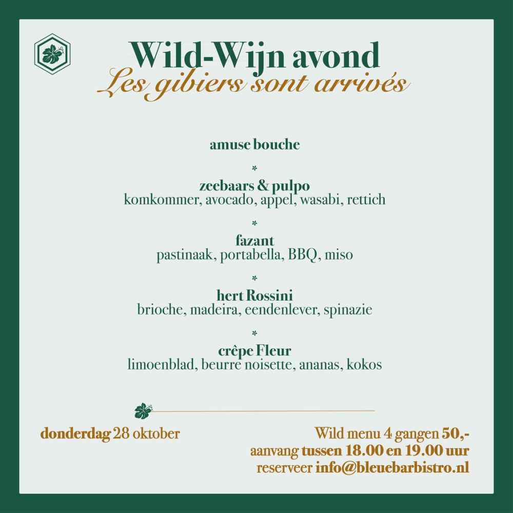 Bleue Bar Bistro zit vol goede ideeën en gaat weer wijn-spijs avonden organiseren. Donderdag 28 oktober staat de eerste wijn-spijs avond gepland: Wild-wijn avond. Deze avond organiseren ze maar voor €50,- per persoon een 4-gangen menu met seizoensproducten, wild en bijpassende wijnen. Deze wijnen worden geserveerd in samenwerking met l'Exception. Check hieronder het menu en maak snel een reservering via info@bleuebarbistro.nl!
