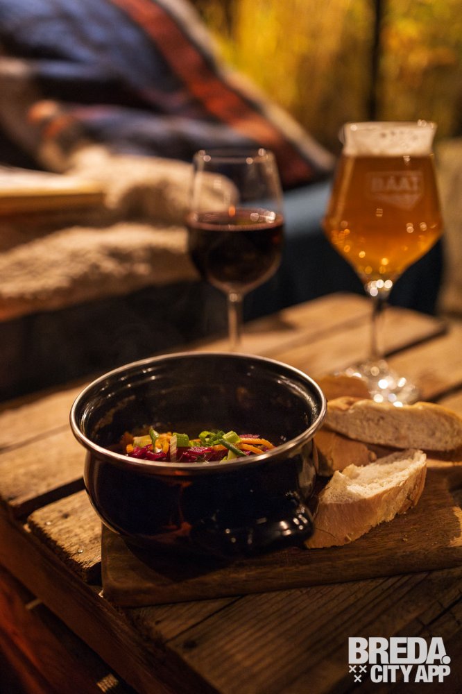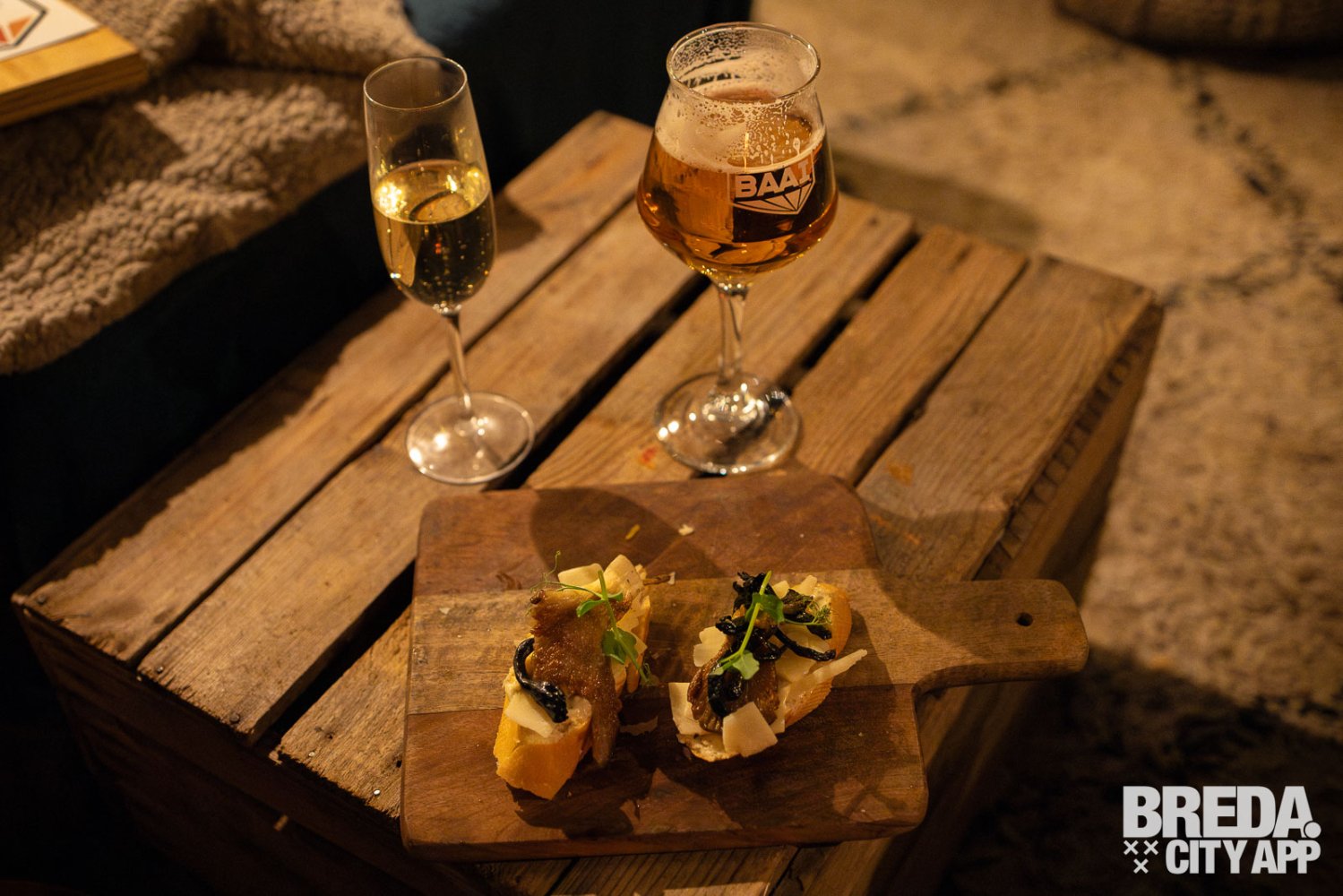 Ondertussen zetten we al wat sfeervolle kerstmuziek op. Het leuke is dat je uit eten bent maar je toch romantisch met zijn tweeën aan een tafeltje zit in je eigen ruimte. Onze eerste drankje bestaat uit een Spaanse cava en een BAAI Bier; een eigen gebrouwen bier dat wordt gebrouwen bij STRND in Breda. Dit ambachtelijke Bredase bier is een bovengistend biertje wat inhoud dat er in tegenstelling tot pilsener het BAAI biertje een vollere smaak krijgt maar wel mooi blond blijft.