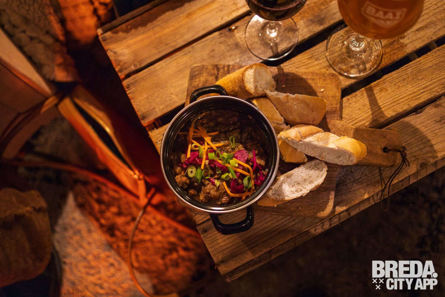 Het volgende gerecht past dan ook goed bij onze wijn en bier. Het gerecht is dan ook een stoofpotje met brood om te samen te delen. Het potje ‘stooft’ nog terwijl de deksel er af wordt gehaald door de vriendelijke bediening. Het zachte vlees en de lekkere kruiden maken het winterse tafereel af maken het delen van het gerecht super gezellig.