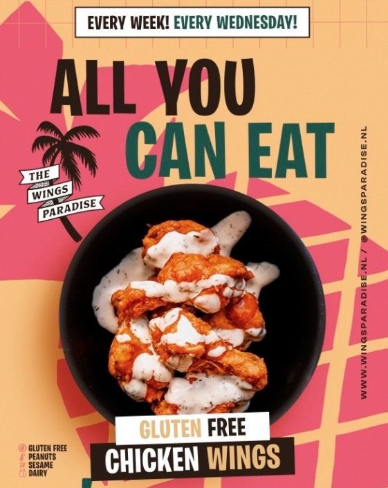 Elke woensdag kun je bij Wings Paradise terecht voor een superleuke All You Can Eat Chicken Wings-ervaring. Voor een vaste prijs kun je 2 uur lang onbeperkt kippenvleugels eten – en dat in allerlei verschillende smaken (vaak meer dan 14 varianten!), allemaal vers bereid met liefde en passie in de keuken. Het is een geweldige manier om midden in de week samen te komen met vrienden of familie en te genieten van een smaakvolle mix van sauzen en dry rubs.