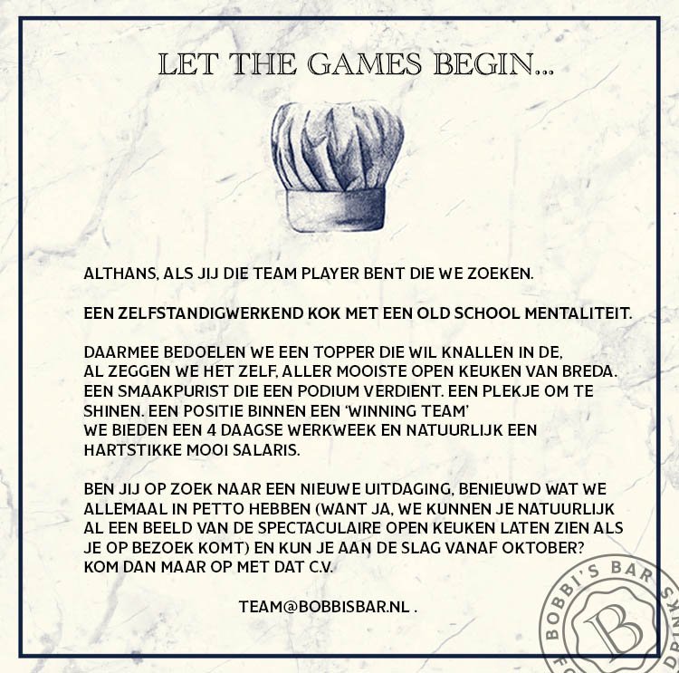 Ben of ken jij degene die we zoeken? Stuur dan je CV en motivatie naar team@bobbisbar.nl