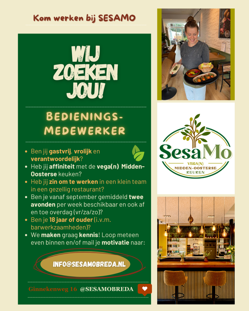 Ben jij degene die we zoeken? 💪 Loop gezellig binnen of stuur een mailtje naar info@sesamobreda.nl